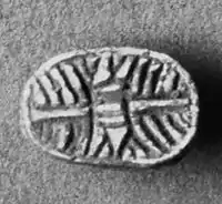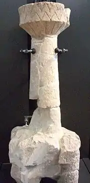 Still in the time-frame of the Prenuragic age, but in this case during the Eneolithic period, there is a remarkable production of "Laconi-type" statue-menhirs or statue-stelae, assigned to the Abealzu-Filigosa culture and characterized by a uniform tripartite scheme encompassing, from top to bottom: a stylized 'T'-shaped human face; the depiction of the enigmatic capovolto (the capsized) in the kind of trident capovolto; and a double-headed dagger in relief.[11][20]