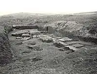A paved road, delimited by vertical slab stones, runs parallel to the latter mortuary area. The construction of the road is supposed to be contemporary to the monumentalization of the necropolis.[35] The Bedini excavations have unearthed an area containing thirty two slab-cist tombs, made of a stone different from the one used in the serpentine-shaped area.[35] The cist tombs were mostly without their cover slabs, as these were wrecked during centuries of agricultural activities in the area. This so-called "Bedini's area" appears to have undergone three phases of development: