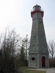 Authorized in 1803 with two other lighthouses by an Act of the Legislative Assembly of Upper Canada, construction of the Gibraltar Point lighthouse did not begin until 1808.[2] It was built to a height of 52 feet (16 m) and extended to 82 feet (25 m) in 1832. The diameter ranges from about 7 metres (23 ft) at the base to about 2.1 metres (6.9 ft) at the top. The base is made from stone quarried in Queenston and the extension from Kingston stone. The lighthouse construction and maintenance was paid for through a harbour fee levied upon all boats entering the harbour.[3] When completed in August 1809, the lighthouse was located 25 feet (7.6 m) from the shore. Since then, sand has built up over time so that it now stands about 100 metres (110 yd) inland.