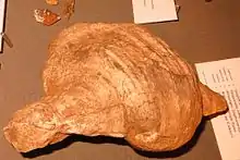 Gigantoproductus giganteus was a large brachiopod that superficially resembled a cockle. Fossils of this species have been found with shell widths of 30 centimetres (12 in).[2] and more than 35 cm (14 in).[4] It had a pair of thick dome-shaped valves joined by a hinge. The valves had a small number of broad ribs that radiated from a thick umbo and there were large wing-shaped ears of calcareous material on either side. The valves were held together by a central strong adductor muscle which left a scar on the inside of the valves. The ventral valve, also known as the pedicle, was covered with spines on the outside. The inside of this valve was rough, being covered by numerous cone-shaped protrusions.[5] These are visible in an internal mould of the brachiopod, a cast fossil which has been formed when a hole in sediment left by the soft tissues of the dead organism was later infiltrated by mineral matter.[6]