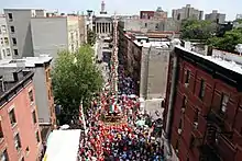 Many families from the town of Brusciano, Italy migrated to East Harlem bringing with their tradition of the yearly Dance of the Giglio festival in honor of Anthony of Padua.[1] The Giglio ("lily" in Italian) is an 80-foot-tall, three-ton statue which is carried and danced through the streets of East Harlem by over 100 members of the society.
