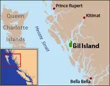 Gil Island is an island on the North Coast of British Columbia, Canada, located on the west side of Whale Channel in the entrance to Douglas Channel, one of the main coastal inlets, on the route of the Inside Passage between Pitt Island and Princess Royal Island. It is 26 km (16 mi) long, with a width ranging from 6 to 13 km (4 to 8 mi), and an area of 231 km2 (89 sq mi). The only named summit on the mountainous island is Mount Gil, which faces the opening of Douglas Channel.[1]