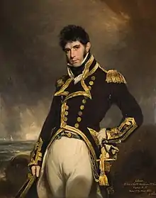 Heathcote's health had improved by 1813 to allow him to return to active service with the command of the newly built 36-gun HMS Scamander, which he took over in October that year.[9] Heathcote was assigned to service in the English Channel, and was in command until mid-1815, when command passed to Captain John Lewis.[9] Heathcote does not appear to have had any further active service. He married Ann Lyell at Southampton on 23 March 1809, and at some point had his portrait painted by William Owen.[5][10][b] He died, still at the rank of post-captain, on 22 April 1831.[3]