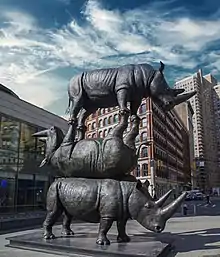 The 2,298 kg bronze sculpture entitled ‘rise up rhino’ was installed at Westfield London on Earth Day 2022.[23] Other Rhino sculptures have been installed in Dubbo,[24] La Trobe University,[25] and Tamarama Beach where the sculpture won the Allen's People's Choice Award and Kids' Choice Award after it survived a king tide.[26][27] They have also made sculptures of lions, tigers, and other animals.