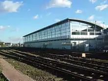 The main source of employment was at Chatham Dockyard, two-thirds of which lay within the boundaries of Gillingham. When it ceased to be a naval base in 1984, there was significant unemployment. A World Heritage Site application has been made for the Dockyard and its defences.[23] Since the 1980s, Gillingham has rebuilt its economic base and the Gillingham Business Park was set up 3 miles (4.8 km) from the town centre, to attract investments and diversify economic activity.[24] The business park and ice rink were an early commission for Grimshaw Architects.[25]