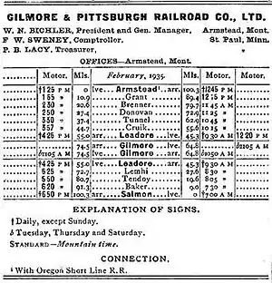 The Gilmore and Pittsburgh Railroad (G&P), now defunct, was an American railroad located in southwestern Montana and east-central Idaho. Constructed in 1909 and 1910 between Armstead, Montana, and Salmon, Idaho, the G&P served mining and agricultural areas in Lemhi County, Idaho, and Beaverhead County, Montana. The line was financially backed by the Northern Pacific Railway (NP) and later became its subsidiary. Never financially successful, the G&P ceased operations in 1939, and the railroad was dismantled the following year.
