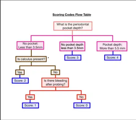 4) Scoring codes range from 0 to 4. This can be accessed based on the flow table attached. A “*” is recorded when a furcation is involved.