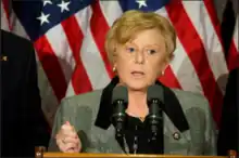 Since entering Congress, Brown-Waite has garnered a lifetime rating of 90 from the American Conservative Union.[5] However, she broke with her party on a few occasions. She criticized George W. Bush for fielding questions from hand-picked crowds. "Let me tell you the difference between a GWB town-hall meeting – George W. Bush – and a GBW – Ginny Brown-Waite – town-hall meeting: I don't load the audience with just the choir," she once said.[6] She was one of five Republicans who voted against a bill to give Terri Schiavo's parents the right to sue in federal court to keep her alive (Schiavo's home was located in the 5th).[7] She is a member of Republican groups such as Christine Todd Whitman's It's My Party Too, Mike Castle's Republican Main Street Partnership, and The Wish List.