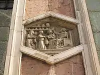 When he died in 1337, he had only finished the lower floor with its marble external revetment: geometric patterns of white marble from Carrara, green marble from Prato and red marble from Siena. This lower floor is decorated on three sides with bas-reliefs in hexagonal panels, seven on each side. When the entrance door was enlarged in 1348, two panels were moved to the empty northern side and only much later, five more panels were commissioned from Luca della Robbia in 1437. The number "seven" has a special meaning in Biblical sense: it symbolizes human perfectibility.