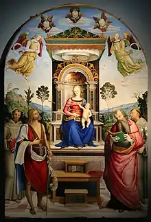 He was also called Bitte, a diminutive of his Christian name and by Vasari, Benedetto, was the son of Bartolommeo Caporali, and was born at Perugia. He was a pupil of Perugino, and also an architect, and built a palace near Cortona for Cardinal Silvio Passerini, which he likewise decorated with frescoes, in the execution of which he was aided by Tommaso Barnabei, better known as Maso Papacello. Many of the churches in Perugia and its neighborhood possess works by Caporali. Other examples may be found in Cortona. His son Giulio Caporali was an architect of the Panicale Cathedral. Another pupil of Caporali was Organtino di Mariano, active 1533 and worked with Giovanni Battista in the church of San Pietro of Perugia.[1]