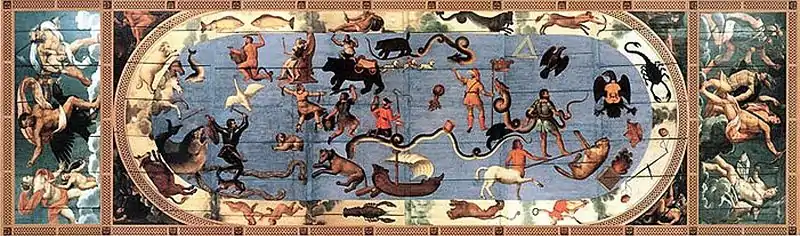 Between 1583 and 1584 he set to work on the ceiling of the dining-hall of Schloss Ambras, depicting Allegories of the Zodiac, the Elements and the Planets.