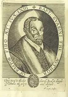 Guarini was born in Ferrara. On the termination of his studies at the universities of Pisa, Padua and Ferrara, he was appointed professor of literature at Ferrara. Soon after his appointment, he published some sonnets which obtained for him great popularity as a poet. In 1567, he entered the service of Alfonso II d'Este, Duke of Ferrara. After about 20 years of service, differences with the Duke led him to resign. After residing successively in Savoy, Mantua, Florence and Urbino, he returned to his native Ferrara. There he discharged one final public mission, that of congratulating Pope Paul V on his election (1605). He died in Venice, where he had been summoned to attend a lawsuit, aged 73.[1]
