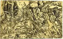 His woodcuts have been described, by Mark McDonald, as "amongst the most important produced in Italy (Rome) during the early years of the sixteenth century",[33] but most Italian makers of independent prints (as opposed to book illustrations) preferred to use engraving.[34] Exceptions include Titian, who experimented with woodcuts (executed by others, but with his encouragement) in these years. One link between the two artists is the unusual size of their woodcuts. At 270 x 445 mm and carved on a single block, Atalanta and Meleager hunting the Calydonian boar takes the woodcut near the edge of what is technically feasible; most woodcuts this size use multiple blocks. There was a fashion, mostly in Germany, for even larger woodcuts that were conceived as murals, either pasted to walls or mounted on textiles like Chinese paintings.[35]