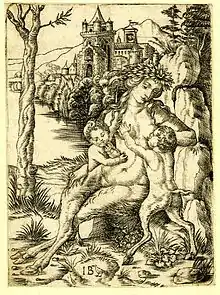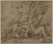 In the drawing the background is a Dürer-esque clump of trees and rocks, but in the print this is replaced by the famous Roman ruin known as the Temple of Minerva Medica, in fact a nymphaeum, given an invented coastal setting.[42] In the print "the classically inspired female nude and accompanying putti [the children] arrange themselves into the sort of tightly knit pyramidal configuration universally associated with principles of Italian High Renaissance design".[43]