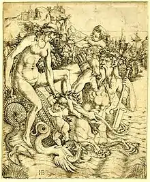 Giovanni Battista Palumba, also known as the Master I.B. with a Bird (or the Bird etc.), was an Italian printmaker active in the early 16th century, making both engravings and woodcuts; he is generally attributed with respectively 14 and 11 of these.[1] He appears to have come from northern Italy, but later worked in Rome.[2] He specialized in subjects from classical mythology,[3] as well as the inevitable religious subjects. Despite his relatively small output, he was a sophisticated artist, whose style shows a number of influences and changes, reflecting awareness of the currents in artistic style at the start of the High Renaissance.[4] The signed prints are usually dated to around 1500–1511.[5]
