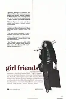 Girlfriends is a 1978 comedy-drama film produced and directed by Claudia Weill and written by Vicki Polon. The film stars Melanie Mayron as Susan Weinblatt, a Jewish photographer who experiences loneliness once her roommate Anne (Anita Skinner) moves out of their apartment in New York City. It was the first American independent film to be funded with grants, although private investors were also brought on to help complete the film.[3]