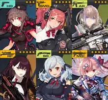 The gameplay involves the acquisition of T-Dolls through gacha game mechanics, where the amount of resources spent on construction can affect the T-Doll acquired. T-Dolls can then be assembled into squads known as echelons and sent into battle to complete combat missions, simulations, or logistics support tasks.[2][10] The T-Dolls are female moe androids each inspired by one real-world small arm. They are categorised into different classes such as handguns, submachine guns, assault rifles, rifles, machine guns and shotguns.
