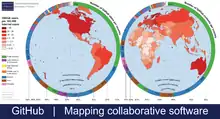 The shading of the map illustrates the number of users as a proportion of each country's Internet population. The circular charts surrounding the two hemispheres depict the total number of GitHub users (left) and commits (right) per country.