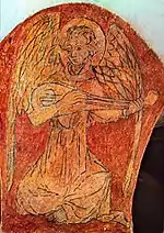 The gittern was a relatively small gut-strung, round-backed instrument that first appears in literature and pictorial representation during the 13th century in Western Europe (Iberian Peninsula, Italy, France, England). It is usually depicted played with a quill plectrum,[1] as can be seen clearly beginning in manuscript illuminations from the thirteenth century. It was also called the guiterna in Spain, guiterne or guiterre in France, the chitarra in Italy and Quintern in Germany.[2] A popular instrument with court musicians, minstrels, and amateurs, the gittern is considered an ancestor of the modern guitar and other instruments like the mandore, bandurria and gallichon.[3][4]