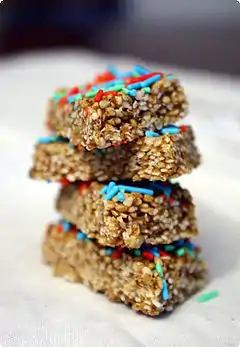 The main ingredient is sesame, which in Sicily and in Calabria is precisely indicated by the terms giuggiulena, gigiolena, giuggiulea or ciciulena. The recipe is based on the composition of sesame seeds poured in honey and fixed by the caramelization of sugar (in an enriched version almonds and candied orange peel are also added), in the way of nougat.[1][2][3]