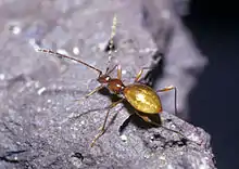 Glacicavicola bathyscioides is a shiny, translucent, brownish-orange, ant-like beetle, approximately 6 mm long by 2mm wide. It has become well-adapted to the troglobitic lifestyle: it has long thin antennae covered in fine setae, and slender legs (also covered in setae) which allow it to easily traverse the difficult terrain present in its environment.[2] The beetle is completely blind, lacking eyes and optic neuropiles.[3] Its abdomen exhibits false physogastry, which means that it appears larger than it truly is, due to the enlarged dome-like elytra which covers the entire abdomen.