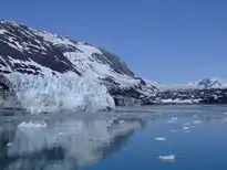 The Johns Hopkins Glacier rises from the Fairweather Range on the east slopes of Lituya Mountain and Mount Salisbury and has an easterly flow towards the head of Johns Hopkins Inlet, 1 mile (1.6 km) southwest of the terminus of Clark Glacier and 79 miles (127 km) northwest of Hoonah. Its rock, ice and snow depict a variety of impressive colors such as grey, blue and white. It was named in 1893 by H.F. Reid after the Johns Hopkins University in Baltimore, Maryland, which sponsored an expedition to this glacier. It is the only advancing tidewater glacier now (its advance started in 1924 when Grand Pacific Glacier started receding towards Tarr Inlet) and is combined with Gilman Glacier (first got attached to Hopkins in the 1990s, broke off and rejoined several times and once again it appears joined since 2000); both are advancing as one single ice block, and at the waterfront, has a width of 1 mile (1.6 km) with a depth of 250 feet (76 m), rises to a height of 250 feet (76 m) and stretches to about 12 miles (19 km) upstream. Submarine calving has also been recorded.[16][26]