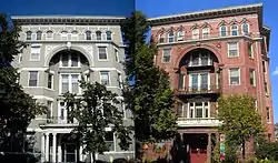 The Gladstone and Hawarden were the first twin apartment buildings constructed in the city and among the first apartment buildings in Washington, D.C. designed specifically for middle class citizens.[2] Following World War II, the area between 14th and 15th Streets, between Massachusetts and Florida Avenues, experienced a dramatic demographic shift. The Hawarden, which had become an apartment building for working class whites, was converted into a co-op in 1949 for middle class black citizens. The residents paid $7,000 for rear apartments and $9,000 for units facing the street.[3] The Gladstone continued serving as apartments for several decades until its conversion into a condominium building. The buildings were added to the District of Columbia Inventory of Historic Sites on January 17, 1990, and the NRHP on September 7, 1994. The pair is also designated as contributing properties to the Greater Fourteenth Street Historic District, listed on the NRHP on November 9, 1994.[5]