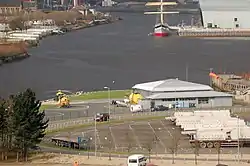 Prior to May 2014 the heliport was located approximately 1.5 mi (2.4 km) East from its present location, within the grounds of the Scottish Exhibition and Conference Centre and directly across the River Clyde from the Glasgow Science Centre and BBC Scotland's Pacific Quay Studios.[3] Planned future development of the SECC area enforced the move.[4]