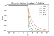 Metropolis–Hastings algorithm gives identical results as Glauber algorithm does, but it is faster.[5] In the Metropolis algorithm, selecting a spin is deterministic. Usually, one may select the spins one by one following some order, for example “typewriter order”. In the Glauber dynamic, however, every spin has an equal chance of being chosen at each time step, regardless of being chosen before. The Metropolis acceptance criterion also includes the Boltzmann weight, , but it always flips a spin in favor of lowering the energy, such that the spin-flip probability is: