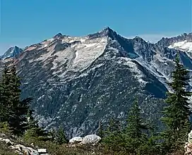 Glee Peak is a 7,180-foot-elevation (2,190-meter) mountain summit located in Whatcom County of Washington state, United States.[2] It is set within North Cascades National Park and Stephen Mather Wilderness, where it is situated 1.7 mile north of The Roost and one mile south of Azure Lake. The nearest higher neighbor is McMillan Spire, 1.7 miles (2.7 km) to the north-northwest.[2] Glee Peak is part of the Picket Range which is a sub-range of the North Cascades, and like many North Cascades peaks, it is more notable for its large, steep rise above local terrain than for its absolute elevation. Topographic relief is significant as the northeast aspect rises 4,000 feet (1,200 meters) above Stetattle Creek in approximately one mile, and the southwest aspect rises 6,000 feet (1,800 meters) above Goodell Creek in three miles. Precipitation runoff from the mountain drains into these two creeks which are both tributaries of the Skagit River. Who made the first ascent of the summit is unknown, but Glee Davis and Burton Babcock were climbing in the immediate area as early as 1905.[3]