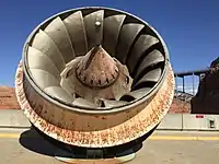 The two spillway tunnels are excavated through the canyon walls on each side of the dam. Twin radial gates, each 40 feet (12 m) wide and 52.5 feet (16.0 m) high, control the flow of water into the spillways. Together, the spillways can pass up to 208,000 cubic feet per second (5,900 m3/s).[5] The tunnels required 132,000 cubic yards (101,000 m3) of excavation and another 110,000 cubic yards (84,000 m3) of concrete lining.[55] The circular, concrete-lined spillway tunnels plunge at a 55-degree angle, reducing in diameter from 48 to 41 feet (15 to 12 m), until they intersect with the old river diversion tunnels at sharp elbow joints before returning to the Colorado River. This was done as a cost-saving measure, but resulted in the destruction of both spillways during the 1983 flood releases. The repairs, in which air slots were installed to prevent cavitation shock waves, cost about $15 million.[122]