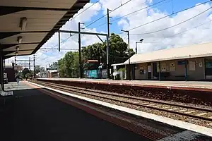 In the mid 1980s, as part of works to add a third track on the Frankston line, the western platform was converted to an island platform.[9] The original station building on this platform, built in the 1880s, was demolished. It was replaced with a brick building, which was opened on 1 July 1987 by the then Minister for Transport Tom Roper, and former Member for Glenhuntly Dr. Gerard Vaughan. It was also during this time that boom barriers were provided at the Glen Huntly Road and the nearby Neerim Road level crossings, in 1986 and 1987 respectively.[10][4] On 28 June 1987, the up face of the island platform was brought into use.[11]