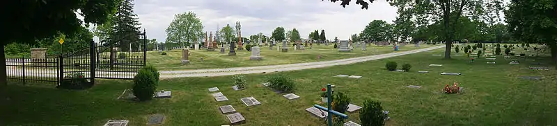 The original grant was of one acre, but with the passage of time, more land came to be needed. The oldest section bordered on the road, and is easily distinguished by the old limestone markers in it. In 1905 the Sykes and Ainley mill donated the piece of land between it and the top of the bank of the hill above the river. A further piece was bought for $30 in 1919. It was purchased from John Haines (1870-1932), a native of Somerset, who purchased Fred Cook's orchard and farm next to the cemetery. Then in 1957 Sheridan Nurseries gave a further piece to the cemetery board.