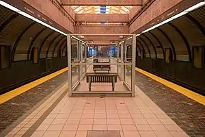 The glass roof is directly above the single centre platform. This is similarly to Yorkdale station, where the interior walls of the station at platform level are unfinished concrete, with curved sections over the tracks to form a lower ceiling. Unlike Yorkdale, the curve is less sudden making the walls more rounded in appearance and they are clad with white horizontal panels between vertical concrete "ribs", along with a wider orange panel strip displaying the station name. Platform level seating is sheltered within glass walls. Wayfinding signage is backlit. Floors and some of the walls are clad with red-brown tiles.
