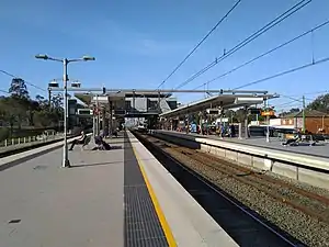 Glenfield station received further redevelopment and expansion as a result of the construction of the South West Rail Link to Leppington.[4] Upgrades in the Glenfield area included the construction includes new car parks, a bus interchange, a new overhead concourse with lifts, a new platform and the replacement of a flat junction between the Main South and East Hills lines with a grade separated junction. A new temporary ticket office was constructed opposite the station in the Magee Lane car park. This served as the ticket office until the construction work at the station was completed. A temporary footbridge provided access to the station after the original eastern entrance was closed. In June 2014, once work was completed, the East Hills line flyover opened, platform 1 became a through platform and platform 4 was brought into service, creating two island platforms.