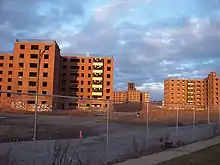 With reduced federal funding and increased operating and utility cost, maintenance of the buildings began to suffer and living conditions of the Glenny Drive Apartments began to decline. By the end of the 1970s, Kensington Heights had a vacancy rate of 64.7% (240 vacant units out of 371 available units).[2] In 1980, a relocation plan was approved and the remaining residents were relocated. The site remained vacant for nearly three decades, becoming significantly deteriorated and vandalized in the process. Demolition began in 2009 but was quickly stopped after concerns about asbestos removal in the buildings.[3] Demolition resumed in 2012. The Buffalo Municipal Housing Authority put the property for sale in July 2016 with one tower still standing. Erie County Medical Center purchased the property in 2017 and plan to use the site for parking. The last tower was demolished in October 2018.