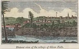 A post office was established in 1808.[6] Glens Falls became an incorporated village in 1839,[6] and was re-incorporated in 1874 and 1887, expanding the village to what would become the city limits[8] when the state legislature granted the city charter in 1908,[8] at which time the city became independent from the town of Queensbury.