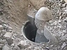To minimise visual impact from the coast the quarry is sited 1 mi (1.6 km) inland, and cut down into the mountain 1,600 ft (500 m) above sea level. Each explosive blast dislodges about 70,000 tons of granite, which is transported by dump truck to the primary crusher, which reduces it to lumps no bigger than nine inches in diameter.[2] It is then transferred by conveyor belt to a heap that covers the "glory hole", a 1,000 ft (300 m) vertical shaft 10 ft (3 m) in diameter, which is permanently full of rocks. At the base of the glory hole, deep inside the mountain, rocks are transferred to a horizontal conveyor and moved through a 1-mile-long (1.6 km) tunnel to the second crusher on the shore, where oceangoing ships are loaded in the deep-water docks at the rate of 6,000 tons per hour.[2]