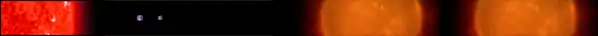 Gliese 667 C is the smallest star in the system, with only around 33%[7] of the mass of the Sun and 34%[7] of the Sun's radius, orbiting approximately 230 AU from the Gliese 667 AB pair.[14] It is a red dwarf with a stellar classification of M1.5. This star is radiating only 1.4% of the Sun's luminosity from its outer atmosphere at a relatively cool effective temperature of 3,440 K.[7] This temperature is what gives it the red-hued glow that is a characteristic of M-type stars.[15] The apparent magnitude of the star is 10.25, giving it an absolute magnitude of about 11.03. It is known to have a system of two planets; claims have been made for up to five additional planets[16] but this is likely to be in error due to failure to account for correlated noise in the radial velocity data.[17][18] The red dwarf status of the star would allow planet Cc, which is in the habitable zone, to receive minimal amounts of ultraviolet radiation.[14]