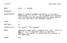 glob – the owner is dmr, short for Dennis Ritchie.The glob command, short for global, originates in the earliest versions of Bell Labs' Unix.[1] The command interpreters of the early versions of Unix (1st through 6th Editions, 1969–1975) relied on a separate program to expand wildcard characters in unquoted arguments to a command: /etc/glob. That program performed the expansion and supplied the expanded list of file paths to the command for execution.