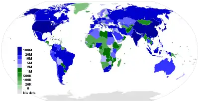 ![]() Fixed broadband Internet subscriptions in 2012 Source: International Telecommunication Union.[17]as a percentage of a country's population |