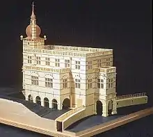 The building had two basement levels, above these the Globe hall and the upper floor with sleeping quarters and a hall facing south. These two upper floors and the roof terrace were connected by a spiral staircase in the tower. The main floor had the main entrance in the North and was level with the first garden terrace. The lower basement was level with the Globe garden to the South. Excluding the extensions or tower, the building measured a respectable 200 m² in area and 14 m in height, perhaps giving rise to the occasional labelling as "Friedrichsburg" (Frederick's castle, in contrast to the palace that was Gottorf Castle). The official designation was "Lusthaus" (folly or hunting lodge); only toward the latter decades of its existence was it called "Globe house". The cubic shape and accessible flat roof were in keeping with contemporary counterparts in Italy, Netherlands and Denmark. The building was supposed to appear exotic and was occasionally called "Persian House". The building detail, however, adhered to the Northern Renaissance that was the norm at the time in the duchies of Schleswig and Holstein.[1]