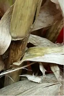 In the spring, fruiting structures (acervuli) form from corn residue and produce banana-shaped[8] spores (conidia) that are dispersed by wind blown raindrops and splashing.[9] Conidial spores infect young plants through the epidermis or stomata.[10] Anthracnose develops rapidly in cloudy, overcast conditions with high temperatures and humidity. In optimal environmental conditions, conidia can germinate in as little as 6–8 hours in 100% humidity.[9] Initial necrotic spots or lesions can be seen within 72 hours after infection by conidia.[11] Lower leaves that develop lesions provide conidial spores and cause secondary infections on the upper leaves and stalk. Vascular infections primarily occur from wounds caused by stalk-boring insects, such as the larvae of the European corn borer, allowing for conidia to infect and colonize the xylem.[12] From this, anthracnose top die back (vascular wilt) or stalk rot can occur. In the fall, C. graminicola survives as a saprophyte on corn leaf residue. The pathogen can also overwinter on corn stalks as conidia in an extracellular secretion. The secretion prevents conidia from desiccating and protects them from unfavorable environmental conditions.[9] Overwintering on corn residue serves as a vital source of primary inoculum for the leaf blight phase in the spring. The cycle will start all over again when susceptible corn seedlings emerge from the ground in the spring.