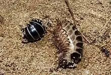 Glomeris marginata is a common European species of pill millipede. It is a short millipede, rounded in cross-section, which is capable of rolling itself up into a ball ("volvation") when disturbed. This behaviour is also found in the pill woodlouse Armadillidium, with which G. marginata is often confused.[2]
