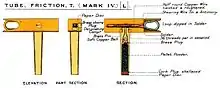 - Friction tube – the tube would have a lanyard attached, with length proportional to the size of the gun, which when pulled caused friction inside the tube which ignited a powder charge, much like striking a match. Single-use. Originally of "copper" and "quill" types, replaced by the "T" tube by the late 1890s. They were used in great quantities by field artillery and are found on old British battlefields up to 1904, e.g. in South Africa. They were inserted in a "radial" vent on top of the breech, or later in axial vents running lengthwise through the centre of the breech such as with the BL 15 pounder. The T design, with the friction wire to which the lanyard was attached running through the crosspiece of the T, ensured that when the lanyard was pulled and the gun recoiled the wire was pulled smoothly out of the T piece without exerting force on the vertical part of the T and hence affecting the gas seal.