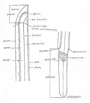 - nakago (茎, tang) – unpolished part of a blade that is concealed by the hilt. (see image)[18][39]