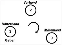 - Middlehand: the person left of forehand and right of rearhand and who is the second player to be dealt cards.
