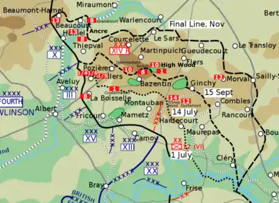 The Battle of Bazentin (14–17 July) was an attack by seven divisions of the Fourth Army on the German second line from north of Contalmaison on the left flank to Longueval on the right.[22] On the left of the attack the Reserve Army carried out subsidiary operations around Ovillers to divert attention from Fourth Army's attack.[23] On 14 July, 34th Division advanced to just south of Pozières, and to their right, 1st Division gained ground north of Contalmaison. On the right of 1st Division, 21st Division captured Bazentin-le-Petit Wood and the village beyond,[24] and on the far right flank 18th Division captured Trônes Wood, some 2.5 miles (4.0 km) south-east of Bazentin le Petit Wood.[25]