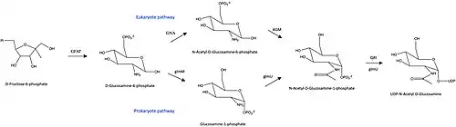 - Milewski S, Gabriel I, Olchowy J (January 2006). "Enzymes of UDP-GlcNAc biosynthesis in yeast". Yeast. 23 (1): 1–14. doi:10.1002/yea.1337. PMID 16408321. S2CID 39940329.