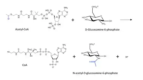 In enzymology, glucosamine-phosphate N-acetyltransferase (GNA) (EC 2.3.1.4) is an enzyme that catalyzes the transfer of an acetyl group from acetyl-CoA to the primary amine in glucosamide-6-phosphate, generating a free CoA and N-acetyl-D-glucosamine-6-phosphate.[1]